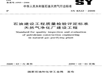 本标准适用于天然气净化厂建设工程质量的检验和评定。 SY 0322-2000 石油建设工程质量检验评定标准 天然气净化厂建设工程 SY0322-2000 标准下载解压密码:www.bzxz.net