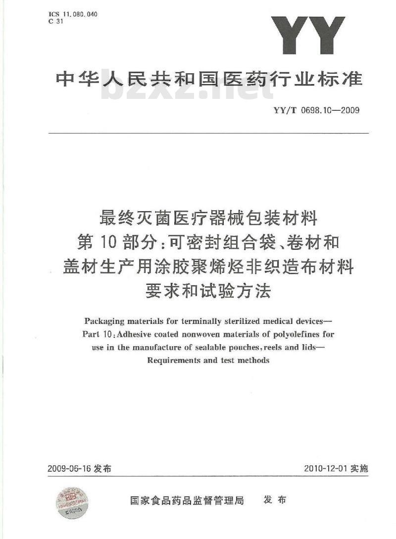 YY/T 0698. 10-2009.Packaging materials for terminally sterilized medical devices-Part 10 : Adhesive coated nonwoven materials of polyolefines for use in the manufacture of sealable pouches, reels and lids-Requirements and test methods.