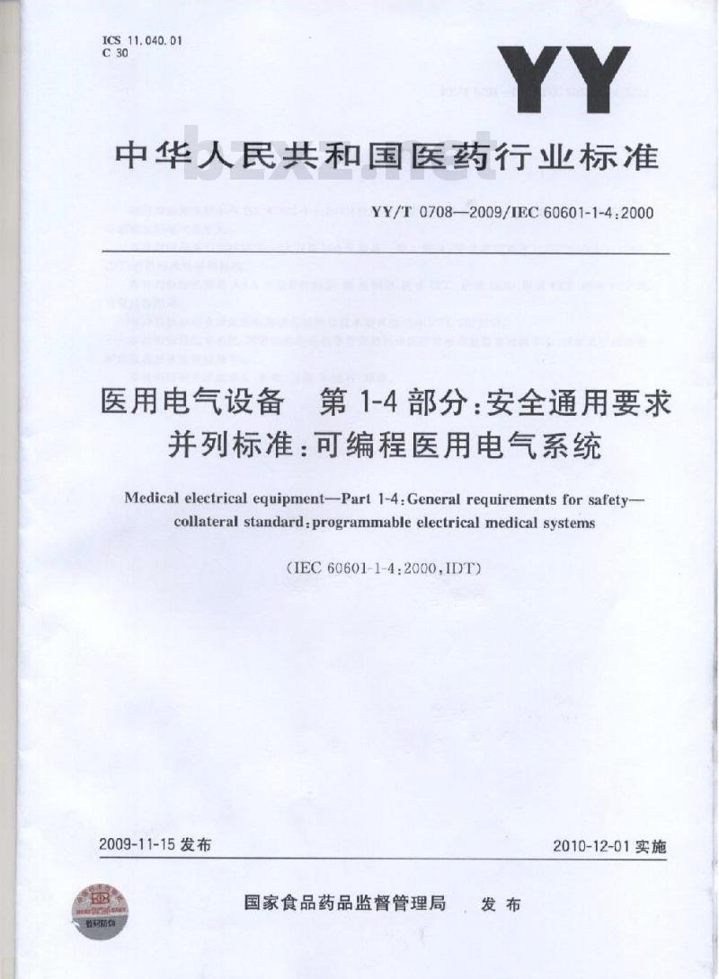 YY/T0708--2009/IEC60601-1-4.2000本并列标准等同采用IEC60601-1-4:2000<医用电气设备第1-4部分:安全通用要求并列标准:可编程医用电气系统》。