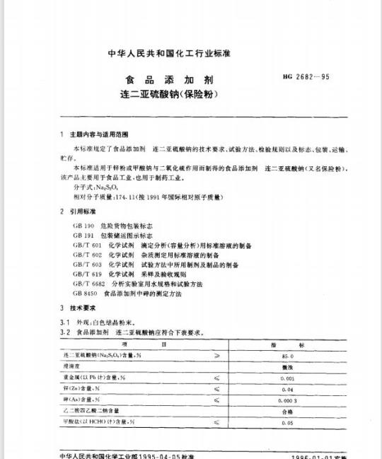 HG 2682适用于锌粉或甲酸钠与二氧化硫作用而制得的食品添加剂连二亚硫酸钠(又名保险粉),该产品主要用于食品工业,也用于制药工业。