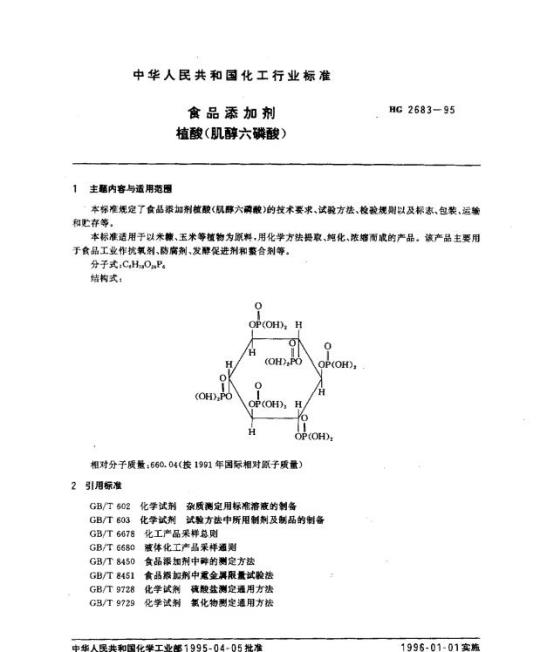 HG 2683规定了食品添加剂楦酸(肌醇六磷酸)的技术要求、试验方法、检验规则以及标志、包装、运输和贮存等。