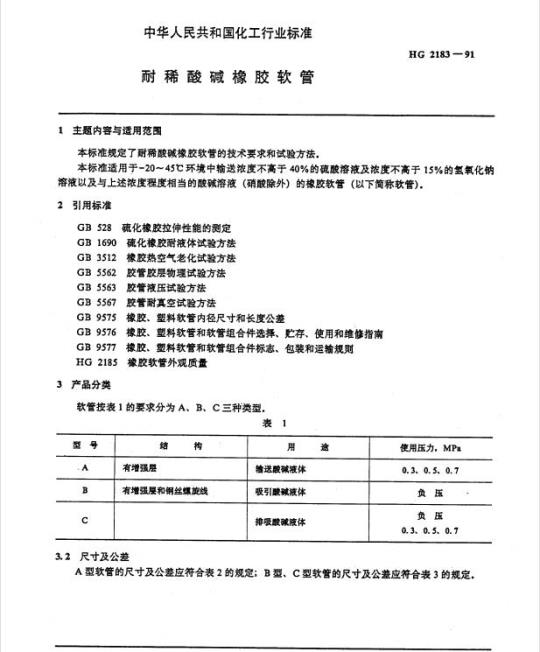 HG 2183适用于-20~45℃环境中输送浓度不高于40%的硫酸溶液及浓度不高于15%的氢氧化钠溶液以及与上述浓度程度相当的酸碱溶液(硝酸除外)的橡胶软管(以下简称软管)。