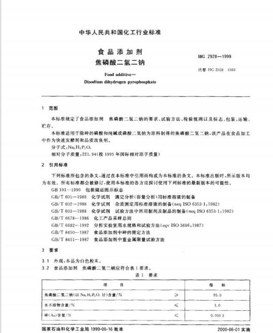 HG 2928适用于除砷的磷酸和纯碱或磷酸二氢钠为原料制得的焦磷酸二氢二钠,该产品在食品加工中作为快速发酵剂和品质改良剂。