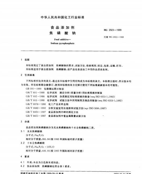 HG 2923规定了食品添加剂焦磷酸钠的要求 、试验方法、检验规则、标志、包装、运输、贮存。