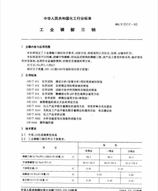 HG/T 2517适用于以纯碱、烧碱中和磷酸,经结晶而制得的磷酸三钠。该产品主要用作软水剂、锅炉清洗剂和洗涤剂,也用作非金属防锈剂、织物丝光增强剂等方面。