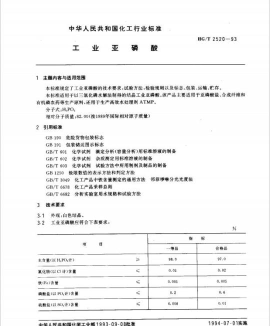 HG/T 2520规定了工业亚磷酸的技术要求,试验方法,检验规则以及标志、包装、运输、贮存。
