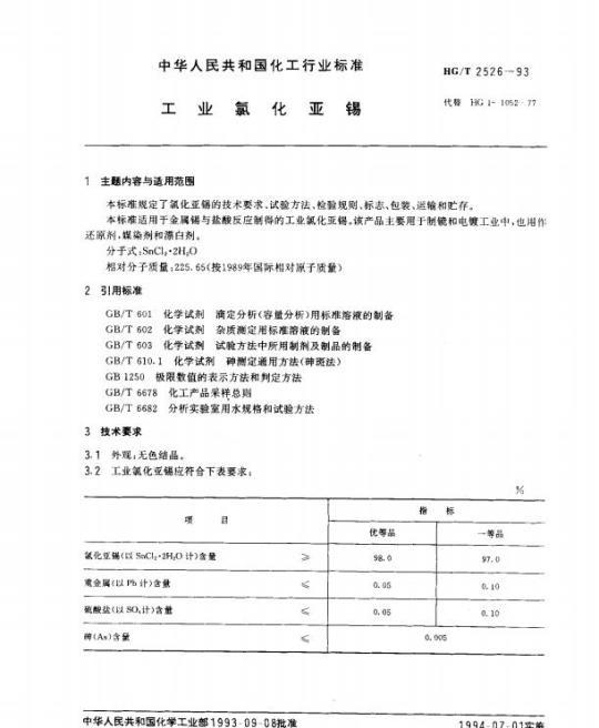 HG/T 2526适用于金属锡与盐酸反应制得的工业氯化亚锡。该产品主要用于制镜和电镀工业中,也用作还原剂,媒染剂和漂白剂。