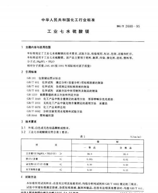 HG/T 2680规定了工业七水硫酸镁的技术要求、试验方法、检验规则、标志、包装、运输和贮存。