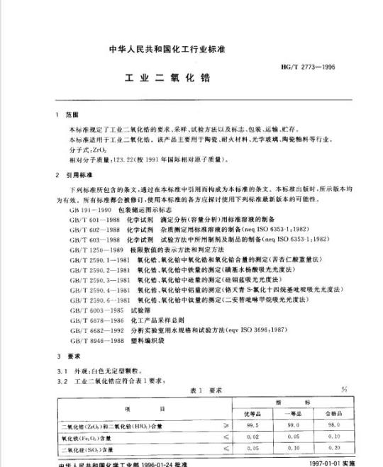 HG/T 2773适用于工业二氧化锆。该产品主要用于陶瓷、耐火材料、光学玻璃、陶瓷釉料等行业。