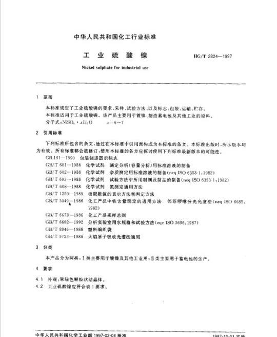 HG/T 2824适用于工业硫酸镍。该产品主要用于镀镍、制造蓄电池及其他工业的原料。
