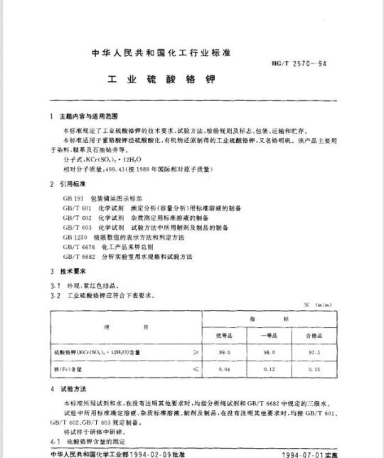 HG/T 2570适用于重铬酸钾经硫酸酸化,有机物还原制得的工业硫酸铬钾,又名铬明矾。该产品主要用于染料,鞣革及石油钻井等。