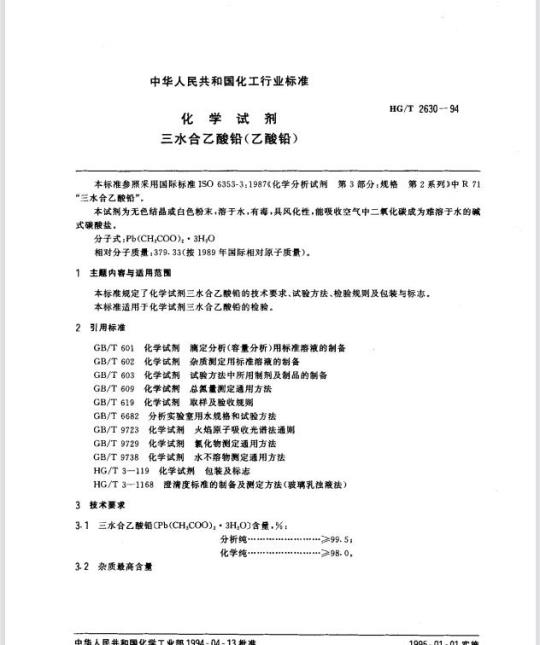 HG/T 2630适用于化学试剂三水合乙酸铅的检验。