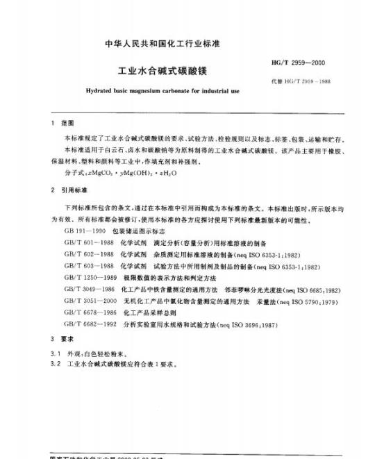 HG/T 2959适用于白云石、卤水和碳酸钠等为原料制得的工业水合碱式碳酸镁。该产品主要用于橡胶、保温材料、塑料和颜料等工业中,作填充剂和补强剂。