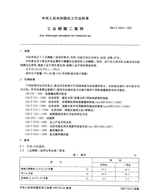 HG/T 2833适用于氧化锌或金属锌与磷酸反应制得的工业磷酸二氢锌。该产品主要用作金属表面的防锈磷化处理剂、陶瓷工业中用作着色剂、玻璃工业中用作澄清剂等。