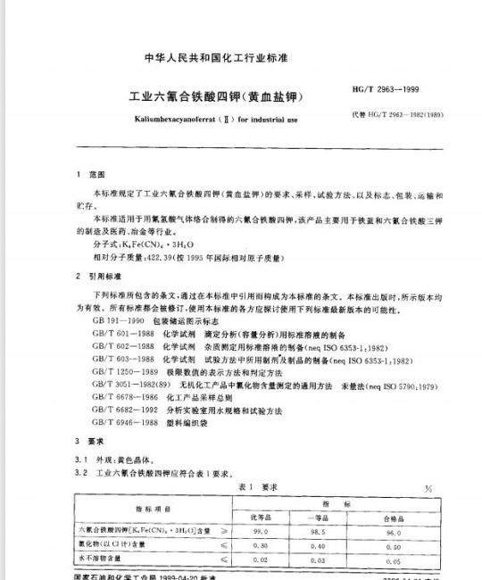 工业六氰合铁酸四钾(黄血盐钾)Kaliumhexacyanoferrat (H) for industrial useHG/T 2963--1999