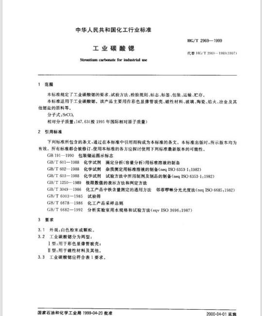 HG/T 2969适用于工业碳酸锶。该产品主要用作彩色显像管玻壳、磁性材料、玻璃、陶瓷、焰火、冶金及其他锶盐的原料等。