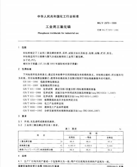HG/T 2970适用于以黄磷与氛气合成法制得的工业用三氯化磷。