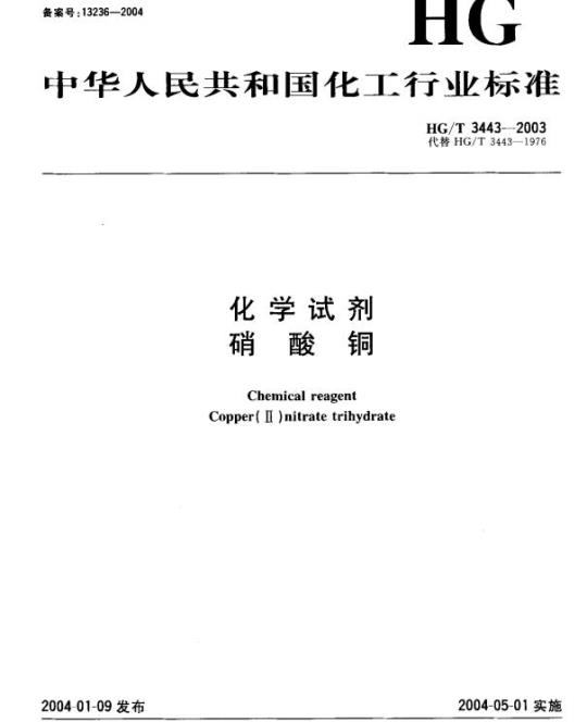 HG/T 3443规定了化学试剂硝酸铜的规格、试验方法、检验规则和包装及标志。
