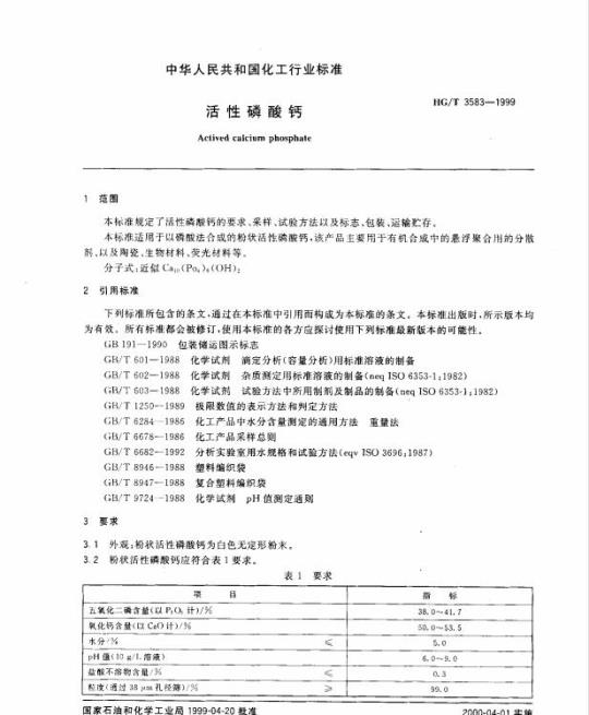 HG/T 3583规定了活性磷酸钙的要求、采样、试验方法以及标志、包装、运输贮存。
