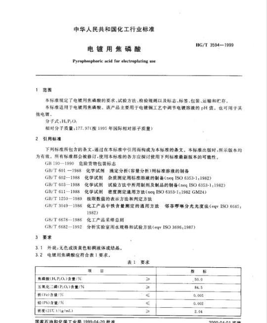 HG/T 3594适用于电镀用焦磷酸。该产品主要用于电镀铜工艺中调节电镀溶液的pH值。也可用于其他电镀。