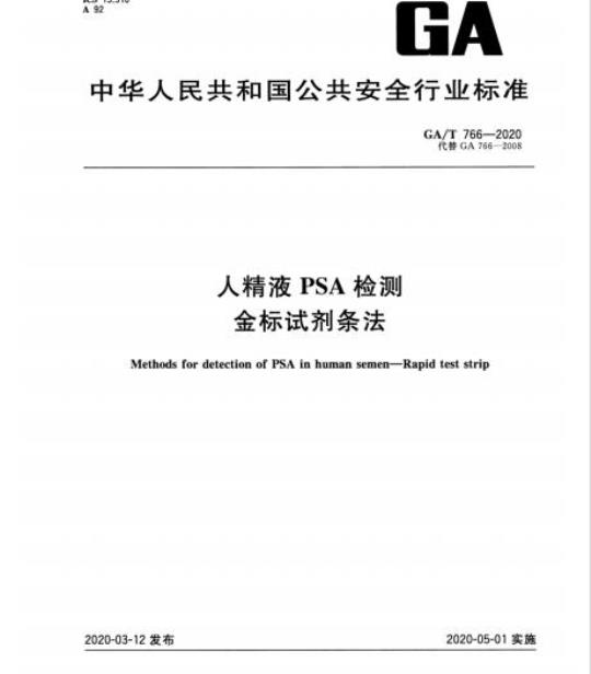 本标准代替GA766—2008《人精液PSA检测划金标试剂条法》,与GA766—2008相比主要技术变化如下: