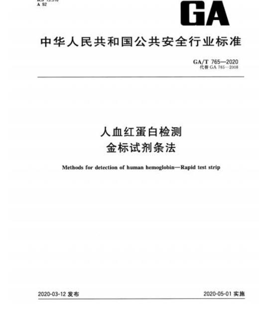GA/T 765适用于法庭科学检验中判断检验鉴定的检材是否含有人血红蛋白的检测。
