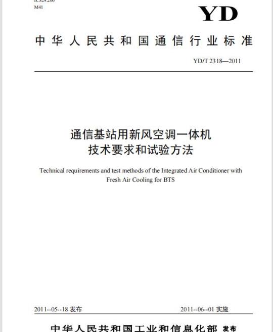 YD/T 2318规定了通信基站用新风空调一体机产品分类、主要组成、技术要求、试验方法、检验规则、标志、包装、运输、贮存。