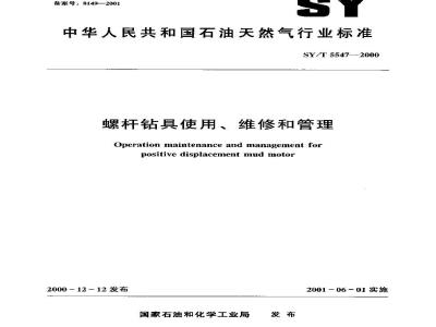 螺杆钻具足将液体压力能转换为机械能、驱动钻头钻进的工具,其质最直接影到钻井周期。由丁钻具结构的不断改进,技术要求的进一步提高,为了使动力钻具在使用、维修和管理过程有一个统一的标准,以规范螺杆钻具的使用,维修与管理,提高钻井效率,本标准对SY5547一92井底动力钻具使用维修和管理》进行了修订。本标准从生效之月起,同时代替SY5547一92。本标准的附录A和附录B都是标准的附录。本标的附录( 和附录1)都是提示的附录。本标准由中国石油天然气集团公司提出。本标准由石油钻井工程专业标准化委员会归口,本标准起草单位:大港游田集团定向井技术服务公司、大港油田集团中成制造有限公司螺杆钻具制造厂。