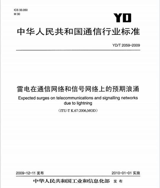 YD/T 2059规定了由于雷电在交换局、用户楼宇和远端节点等建筑物内外的通信接入网络和信号线路各过渡点造成的预期浪涌(过电压和过电流)。