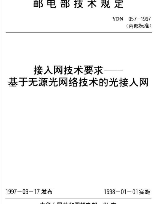 YDN 057规定了采用无源光分配网络(ODN),基于一点到多点的拓扑结构,可传送双向交互式业务的光接入网(OAN)的主要技术要求,适用于公用电信网的接入网环境,特别是业务量需求不很大的企事业单位和居民用户,可以提供从64kbit/s到ISDN一次群(2Mbit/s)的接入能力。本标准所规定的OAN能为满足用户将来需要而具有灵活的升级能力,特别是ODN部分。本标准是以上行信道采用时分多址接入(TDMA)通信协议为基