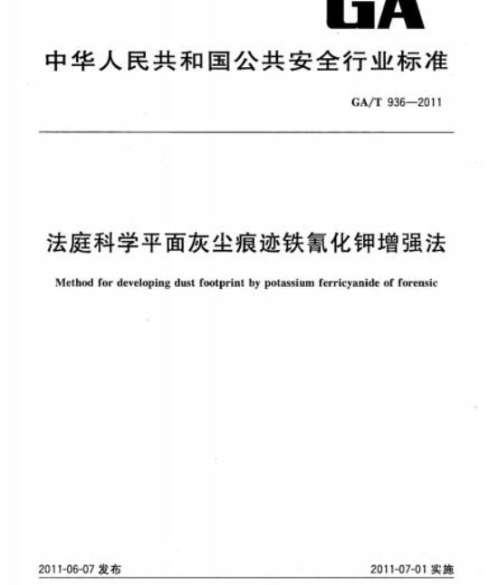 GA/T 936规定了铁氰化钾(potassium frricyanide, K,[Fe(CN)。])增强平面灰尘痕迹的基本方法及其适用对象、原理、试剂、器材、操作方法和要求