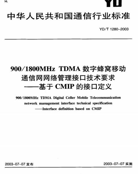 YD/T 1280适用于对900/1800MHzTDMA数字蜂窝移动通信网的网络管理。