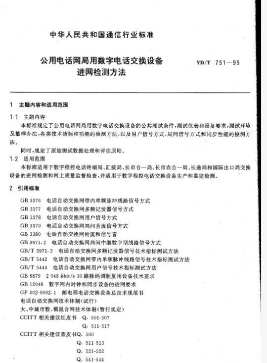 YD/T 751适用于数字程控电话终端局、汇接局、长市合一局、长市农合一局、长途局和国际出口局交换设备的进网检测和网上质量监督检查,并适用于数字程控电话交换设备生产和鉴定检测。