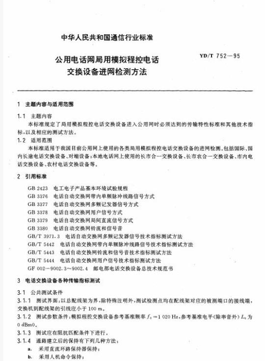 YD/T 752适用于我国目前公用网上使用的各类局用模拟程控电话交换设备的进网检测。包括国际、国内长途电话交换设备、对端设备;本地电话网上使用的长市合一交换设备、长市农合一交换设备、市内电话交换设备、农村电话交换设备等。