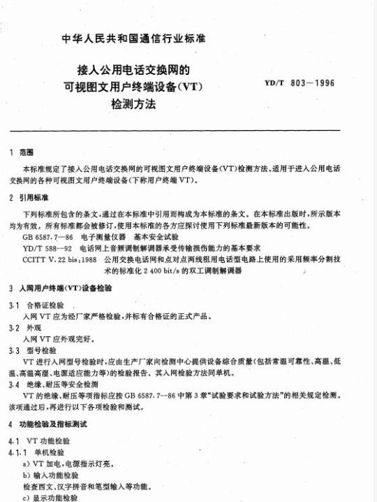 YD/T 803规定了接入公用电话交换网的可视图文用户终端设备(VT)检测方法o适用于进入公用电话交换网的各种可视图文用户终端设备(下称用户终端VT)。
