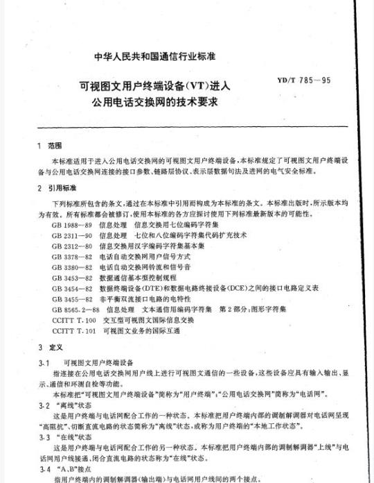 YD/T 785适用于进入公用电话交换网的可视图文用户终端设备,本标准规定了可视图文用户终端设备与公用电话交换网连接的接口参数、链路层协议、表示层数据句法及进网的电气安全标准。