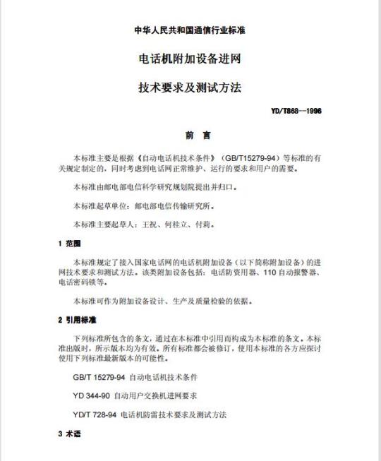YD/T 868规定了接入国家电话网的电话机附加设备(以下简称附加设备)的进网技术要求和测试方法。该类附加设备包括:电话防资用器、110自动报警器、电话密码锁等。