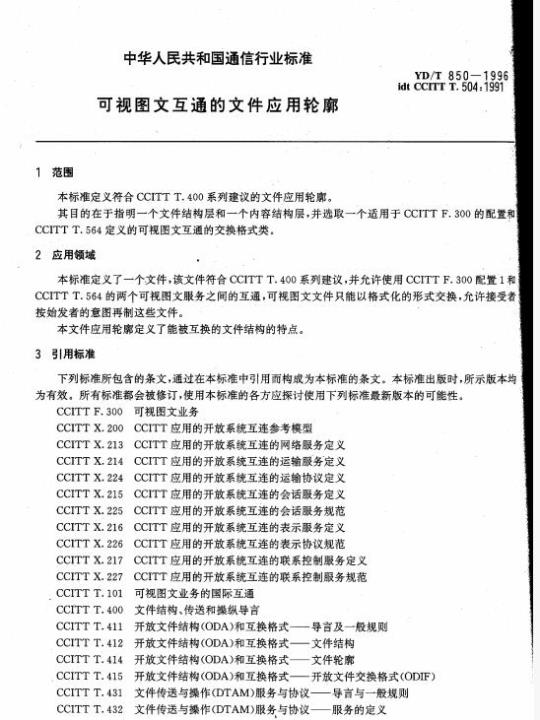 本标准定义符合CCITTT.400系列建议的文件应用轮廓。YD/T850—1996