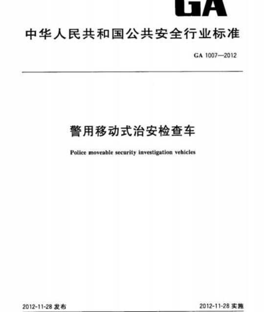GA 1007规定了警用移动式治安检查车的术语和定义、分类与代号、技术要求、试验方法、检测规则、标志运输和贮存。
