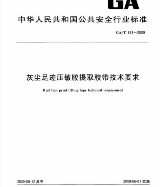 GA/T 831适用于灰尘足迹压敏胶提取胶带的设计和生产,也可作为有关部门采购和验收此类材料的依据。