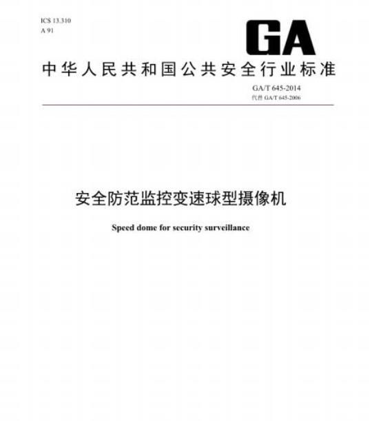 GA/T 645规定了安全防范视频监控系统中变速球型摄像机的分类及标识、技术要求、试验方法、检验规则和标志、包装、运输、贮存等技术要求。