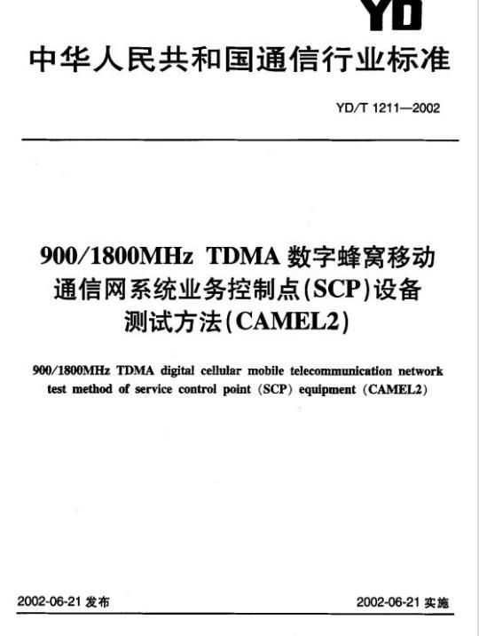 YD/T 1211规定了900/1800MHz TDMA数字蜂窝移动通信网业务控制点(SCP) 设备(CAMEL2)的测试要求。本标准适用于GSM系统中智能网设备业务控制点(SCP) 的测试。