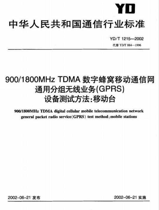 YD/T 1215规定了900/1800MHz TDMA数字蜂窝移动通信网支持通用分组无线业务(GPRS) 的移动台(MS)在业务、功能、性能、环境适应性等方面的测试方法。