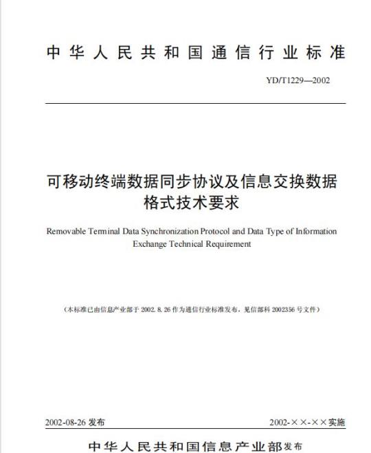 YD/T 1229规定了各种可移动设备(如:移动电话、PDA、 掌上电脑等)之间以及移动设备与PC机、服务器之间数据同步和信息交换的相关协议,在数据同步和信息交换协议的基础上规定了进行信息交换的数据类型及格式。