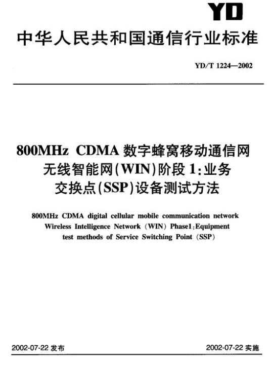 YD/T 1224规定了在WIN第一阶段以及预付费业务对800MHzCDMA数字蜂窝移动通信网无线智能网(WIN)阶段1:业务交换点(SSP) 设备的基本功能、计费、维护管理、性能指标等的测试要求。