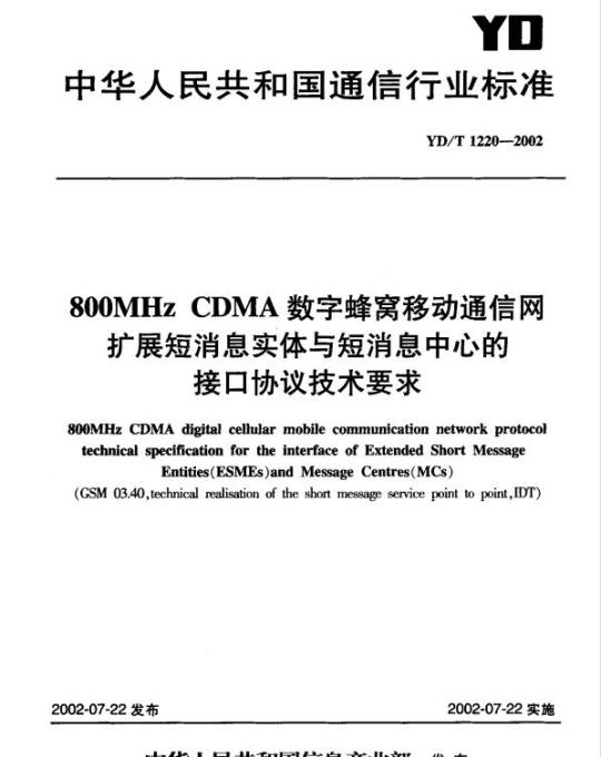 YD/T 1220规定了800MHzCDMA数字蜂窝移动通信网扩展短消息实体与短消息中心的通信协议的技术细节。