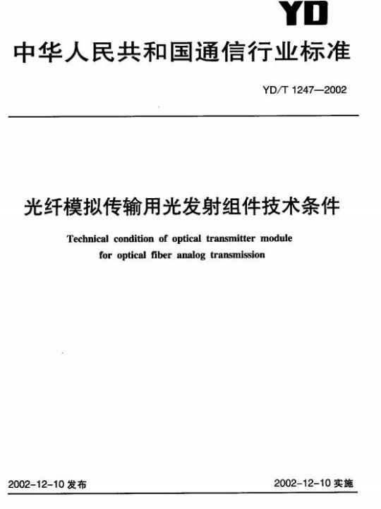 YD/T 1247规定了光纤模拟传输用光发射组件的技术要求、测试方法、检验规则、标志、包装、贮存和运输要求等。