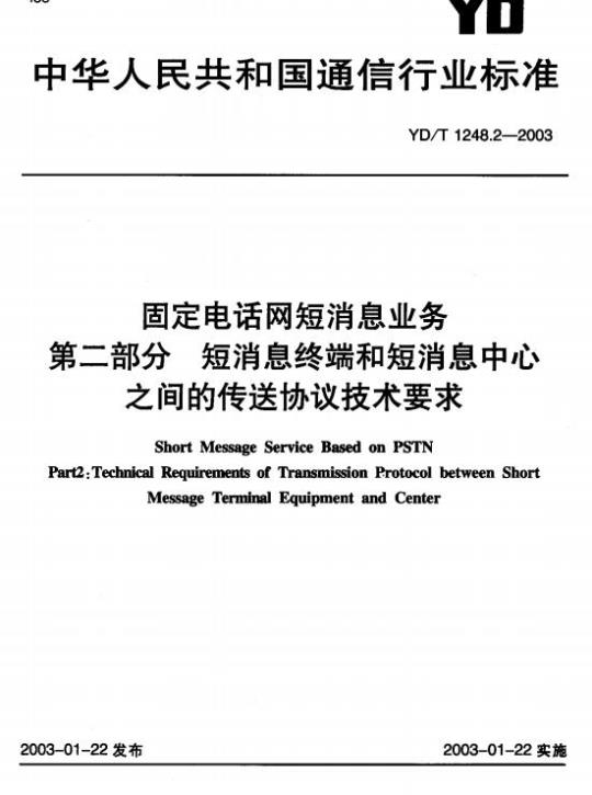YD/T 1248.2适用于固定电话网(PSTN), 上短消 息传送业务的实施。