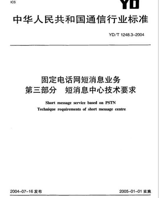 YD/T 1248.3适用于公共交换电话网(PSTN)上短消 息传送业务的实施,以及短消息中心各设备的设计、生产和质量检测。