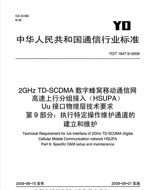 YD/T 1847.9规定了2GHz TD-SCDMA数字蜂窝移动通信网高速上行分组接入(HSUPA) Iub接口上执行特定O&M通道的建立和维护的基本流程和标准。